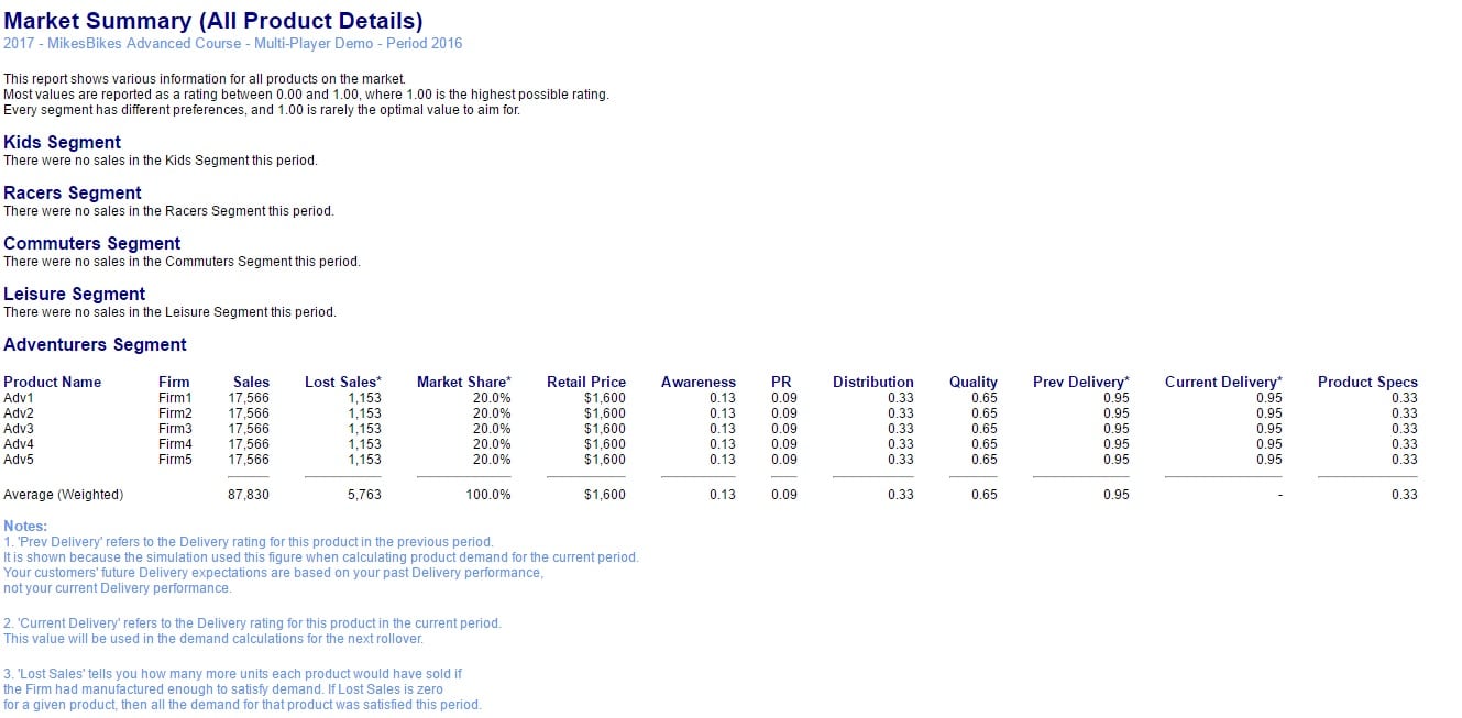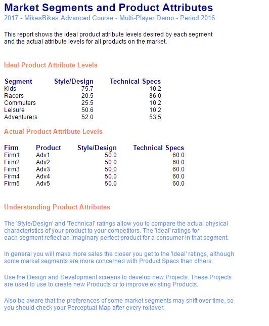 The Product Specs is a statement of how a design is made, what it is intended to do and if it complies with the preferences of each market segment. The ideal product attribute levels desired by each segment and the actual attribute levels for all products on the market are in the Market Segments and Product Attributes Report (go to Design and Development menu ->Reports tab)