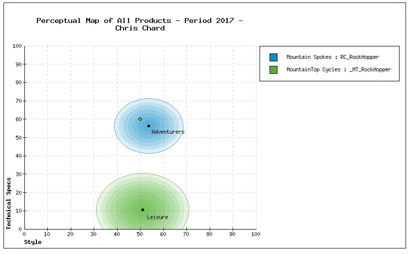 Note that the Perceptual Map chart (which you can find in the Key Reports menu) also show the ideal consumer preferences for last period. The ideal points tend to shift over time in MikesBikes Advanced due to changes in the preferences of the consumers. If you aim for what you currently see on the map, then you are likely to find the segment center points have shifted slightly when you see the results after the rollover.