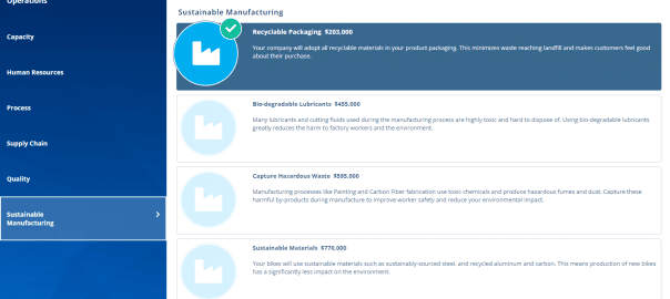 From year three students can invest in sustainable manufacturing options to become an ethical player in the market.