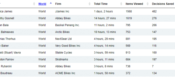 Click on any of the headings to sort by student name, world/industry, firm, total time, etc.