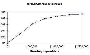 About half of your brand awareness will carry over from the previous period. The curve shows the increase in brand awareness (on top of what is carried over) achieved by various levels of expenditure.