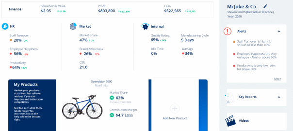 Smartsims provides Business Simulations which run in a web-browser and are used for teaching in tertiary or higher education courses.