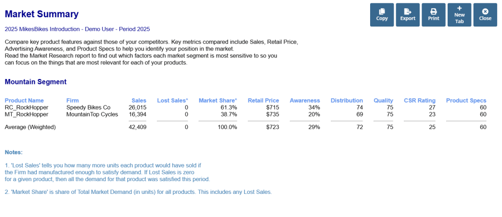 The effectiveness of your advertising budget and allocation (mix) is measured by the awareness of your product in the minds of customers. You can track your Product’s Awareness rating and compare with competitors through the Market Summary report.