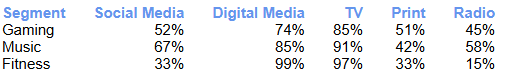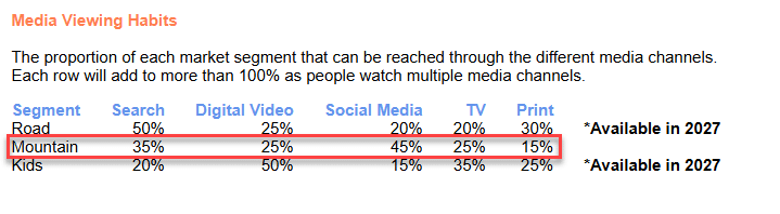 - The table indicates that the majority of the Mountain segment can be reached through Social Media (45%), followed by Search (35%). Digital Video and TV each account for 25%, while Print reaches the smallest portion at 15%. You can then use this information with the reach curves to calculate the percentage of the market segment you’re actually reaching.