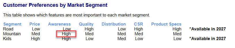 If we look at the Market Information Report, we will see in the Product Dimension Sensitivities that the Mountain segment has High sensitivity in Awareness.